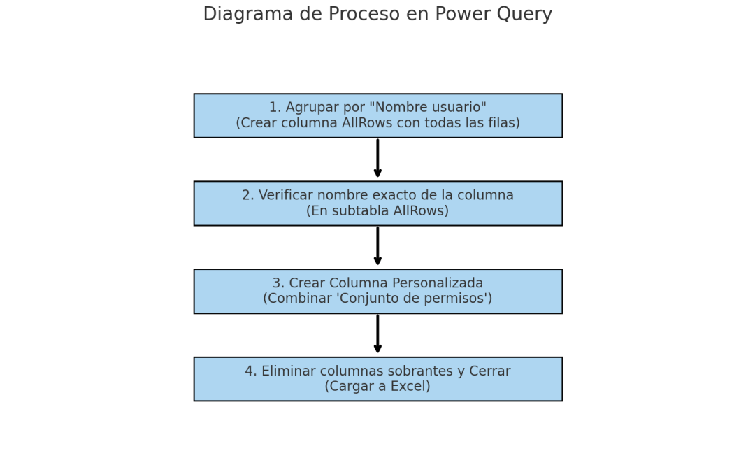 Siguiendo estos pasos, Power Query concatenará correctamente los valores de “Conjunto de permisos” en una sola celda para cada “Nombre usuario”, aunque no dispongas de la opción “Texto combinado” de manera nativa.